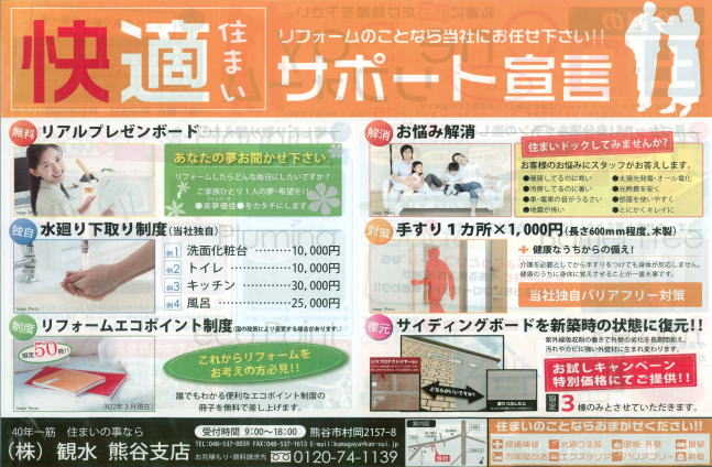 埼玉県北部(熊谷、行田、深谷、本庄周辺)のリフォーム工事なら株式会社観水にお任せ下さい。
